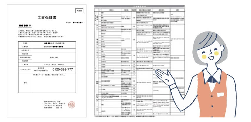工事・設備、2つの保証書を発行します 完工後からが本当のお付き合いの始まりです。お客様の事を知るため、原則的に完工アンケートをご記入いただき、保証書をお渡しさせていただきます。