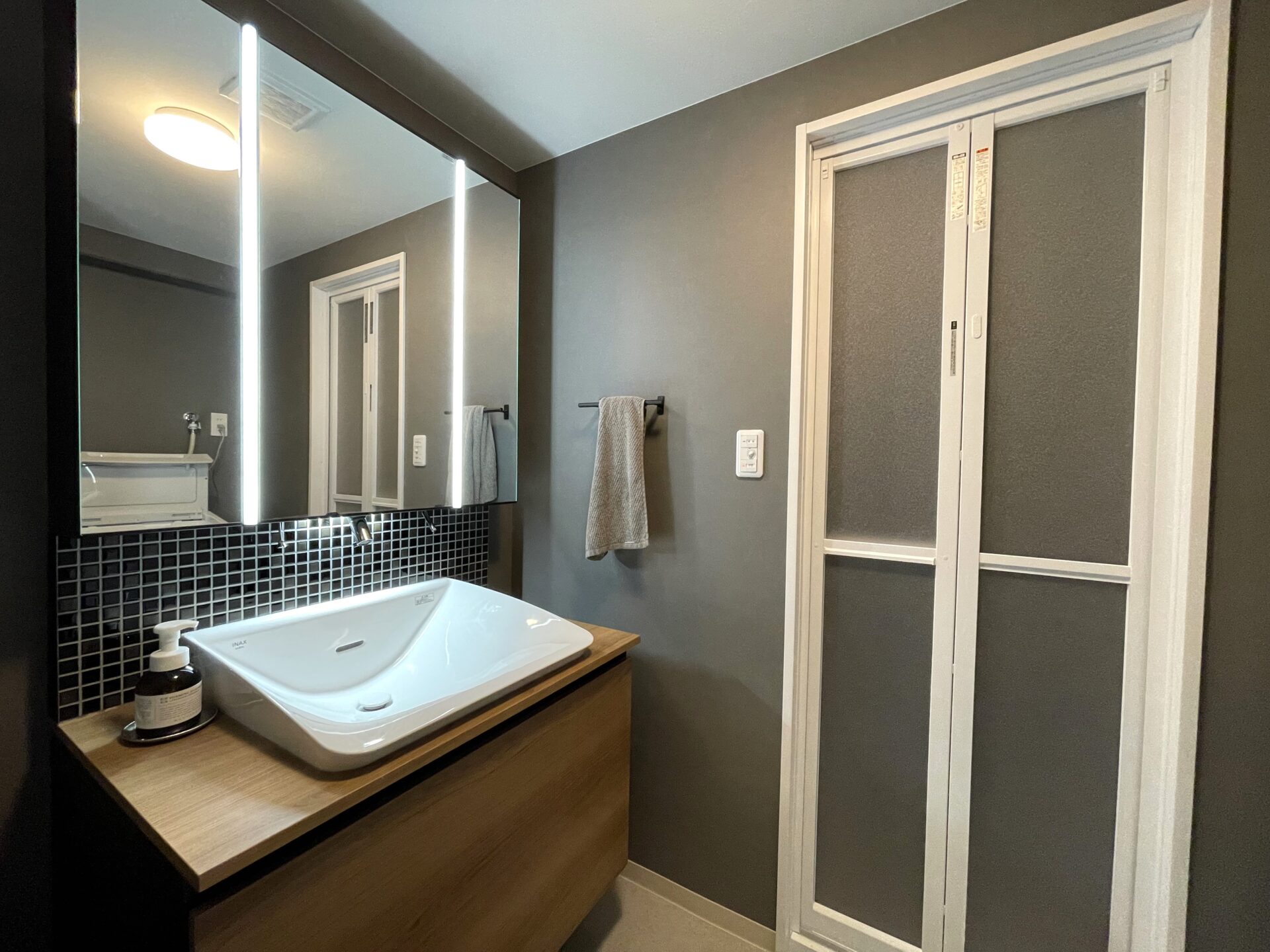 今回お施主様がこだわられた洗面室はライン照明とシックな内装が映える空間になりました。