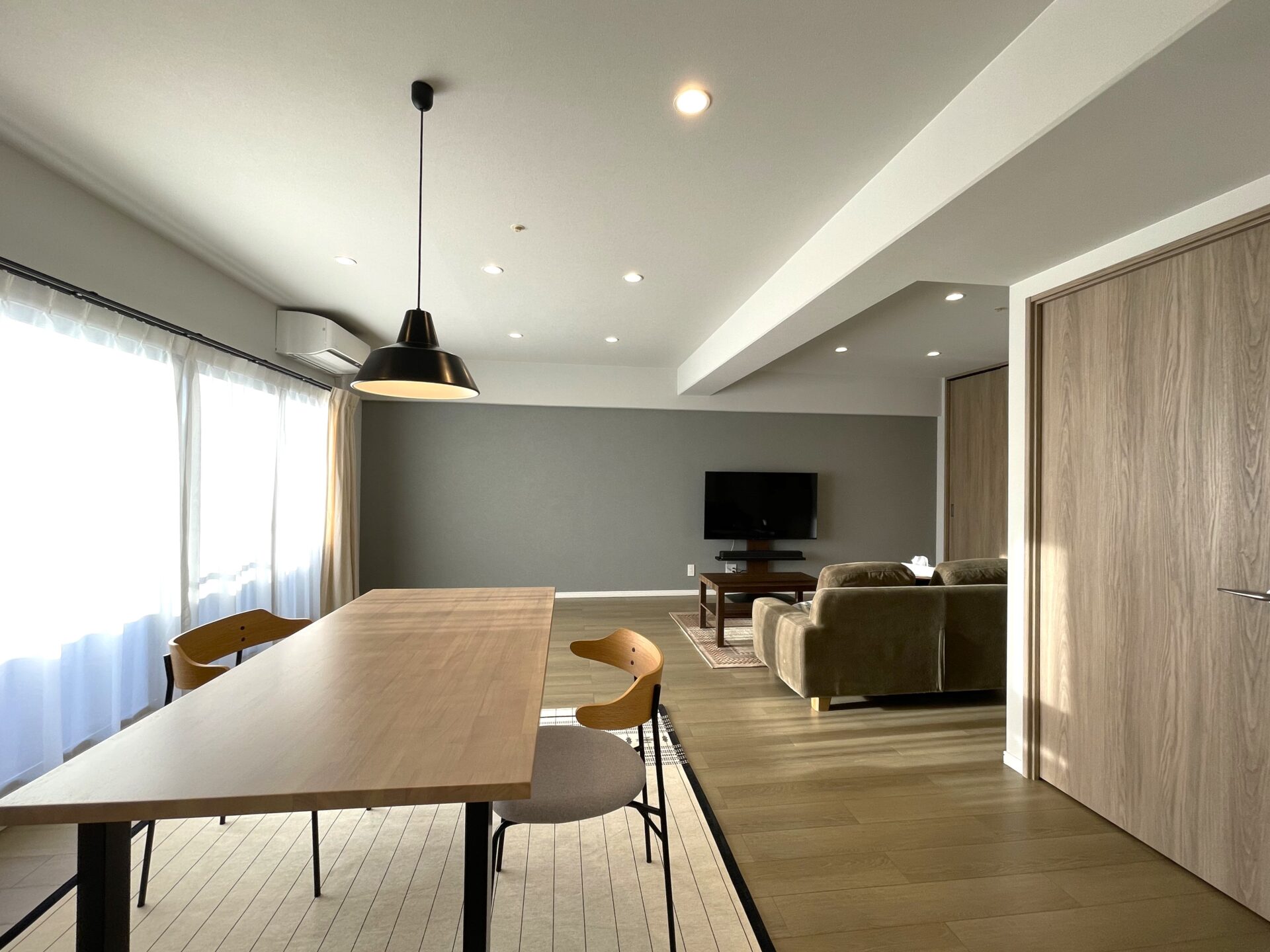 建具は柔らかい印象のオーク調で揃えることで、インテリアや家具が映えるLDKに。