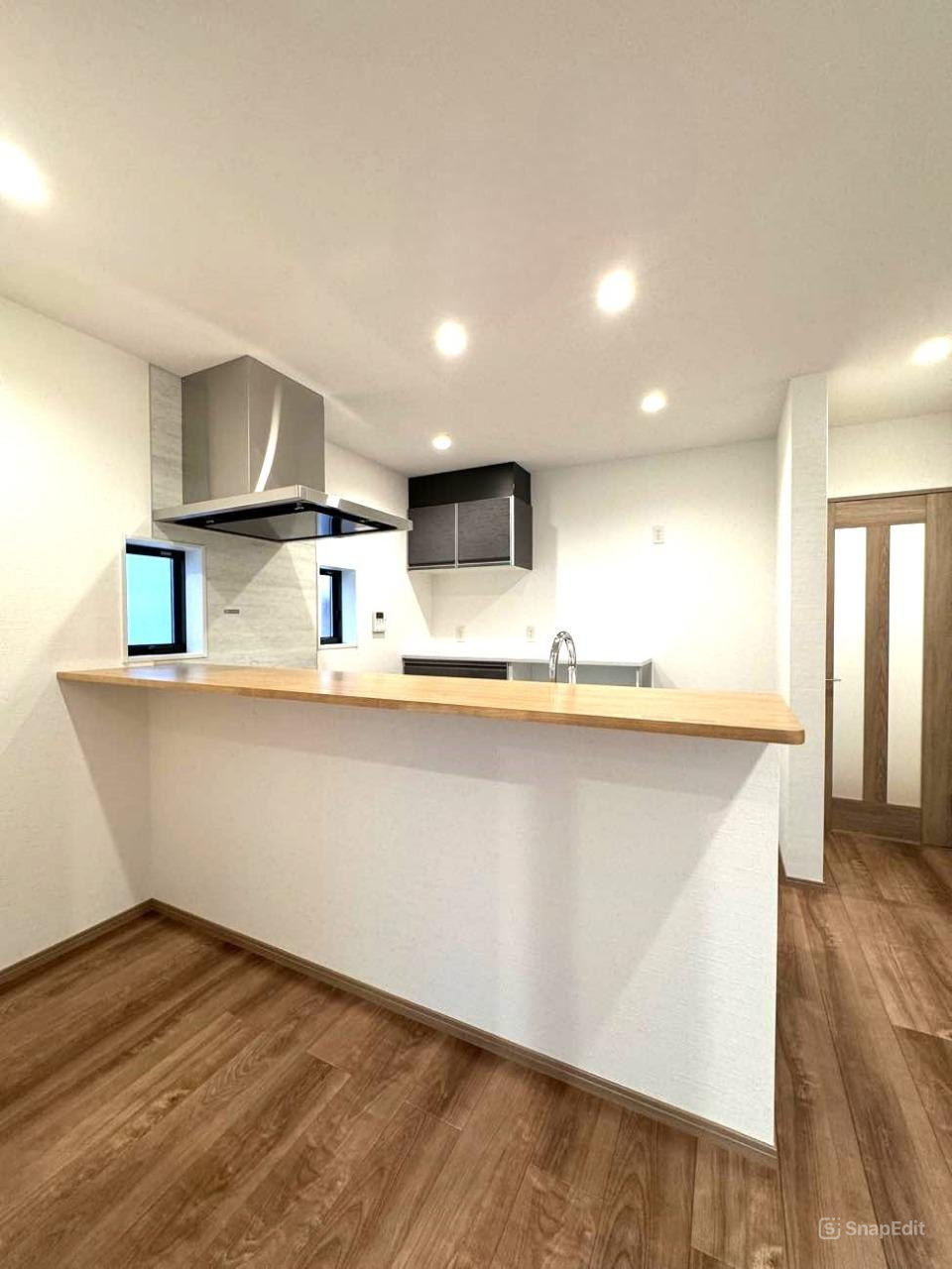 ダイニングを見渡せるように壁付けのL字型のキッチンは対面式に。