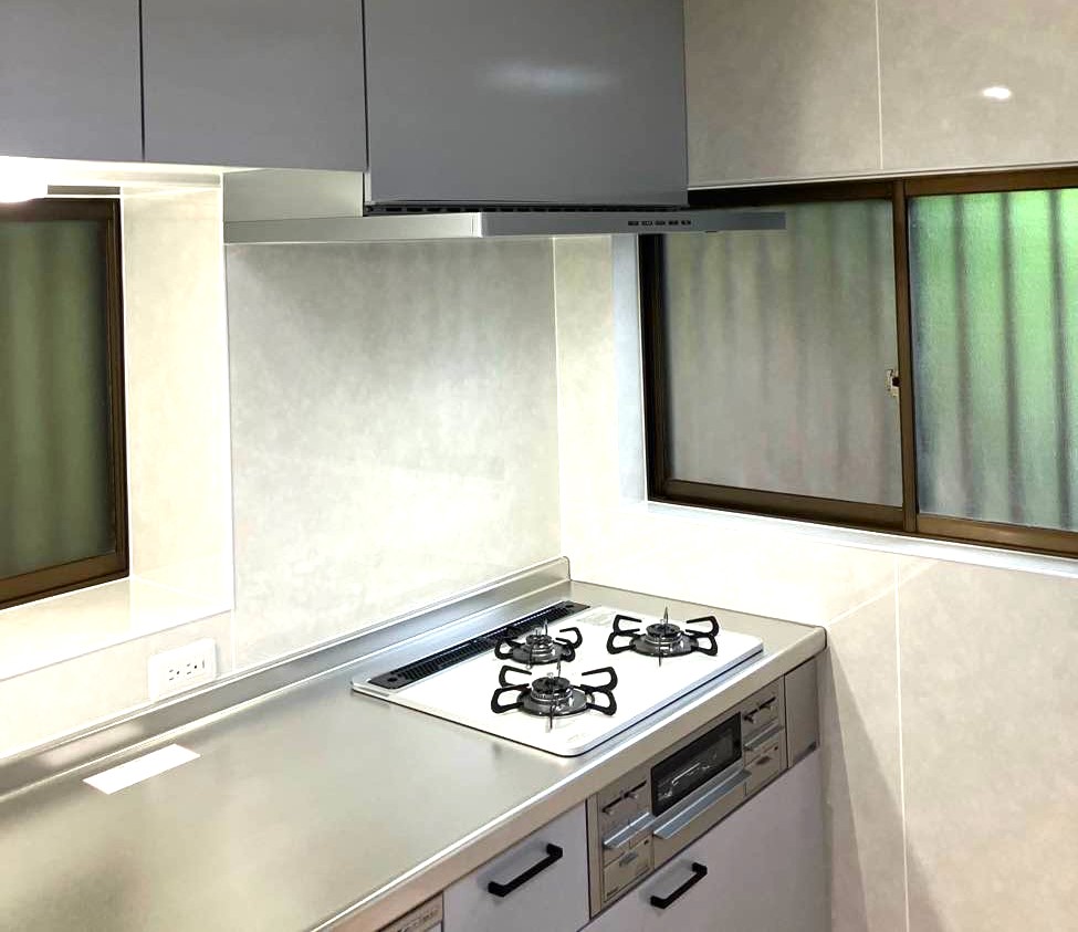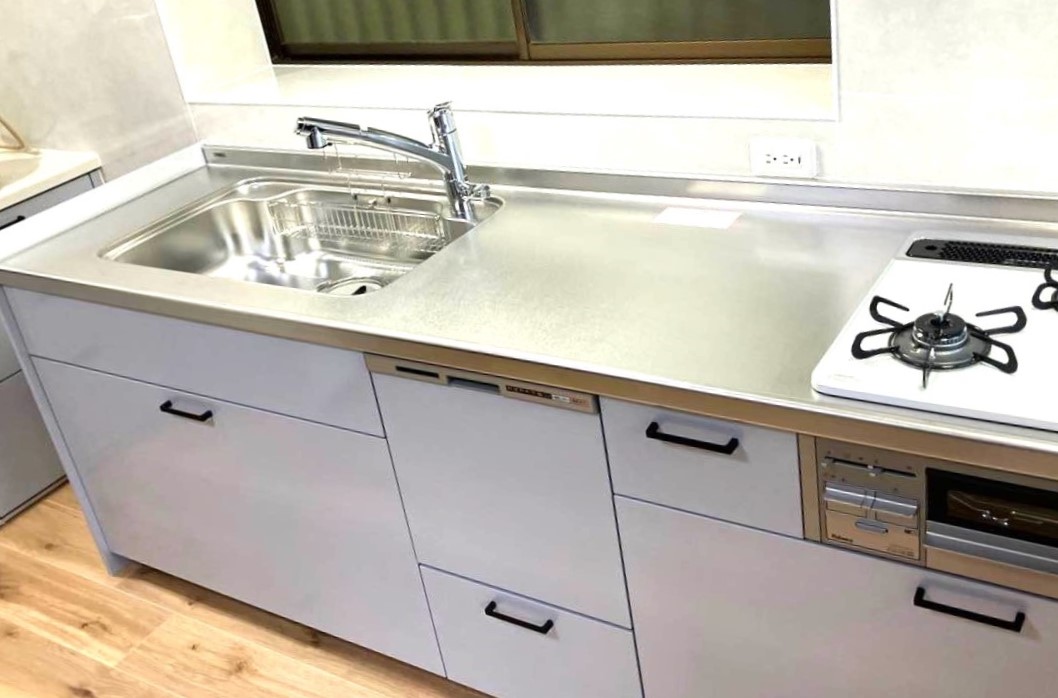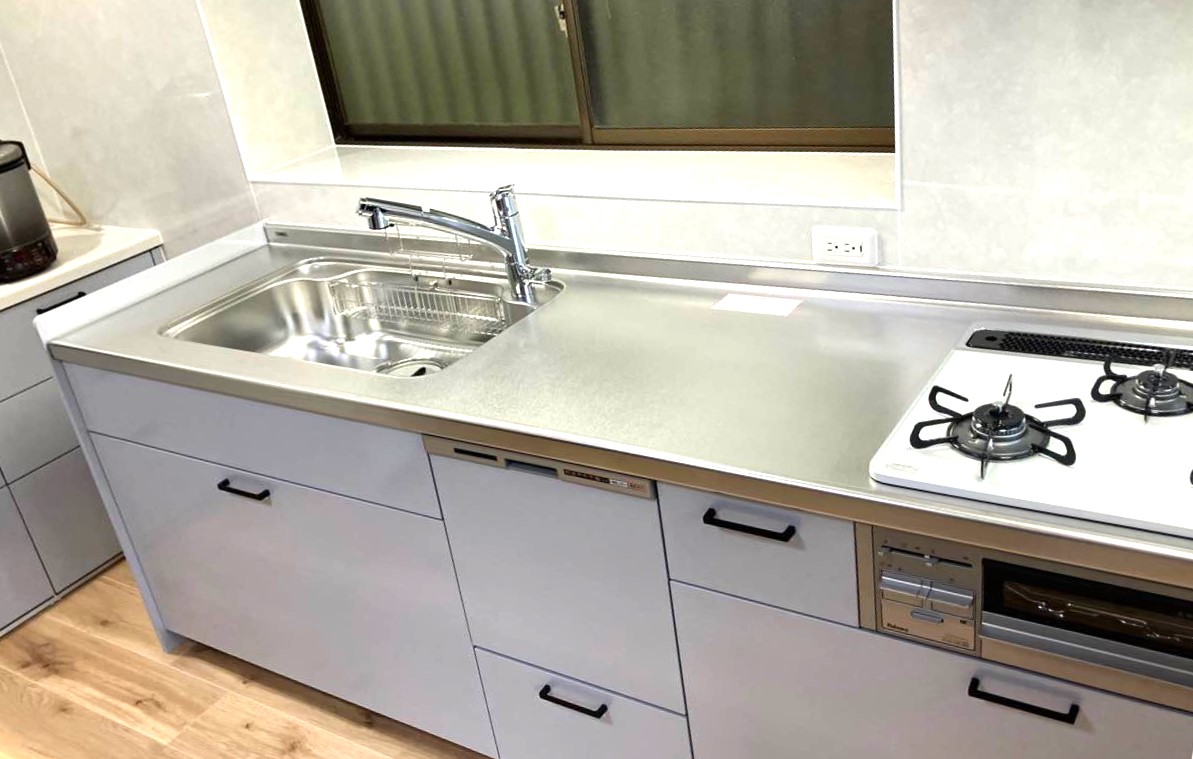 L字のキッチンからI型へ、コンロの位置を左側から右側に変更することで家事動線の改善が図れ、調理などの作業効率を向上できます。