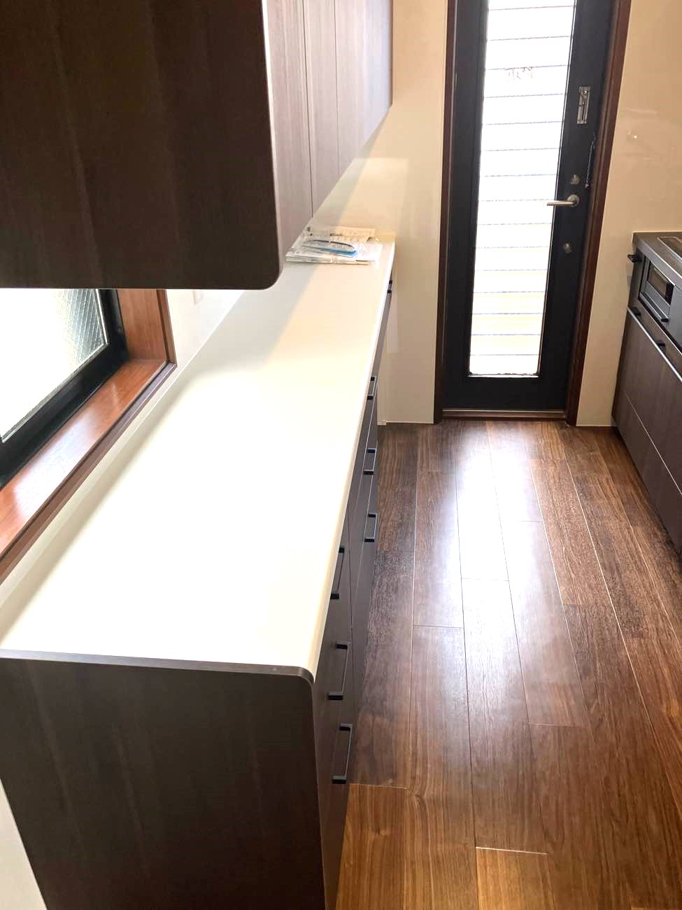 キッチン上部の吊戸棚を無くしたことで、開放感が生まれキッチンも明るさが増しました。