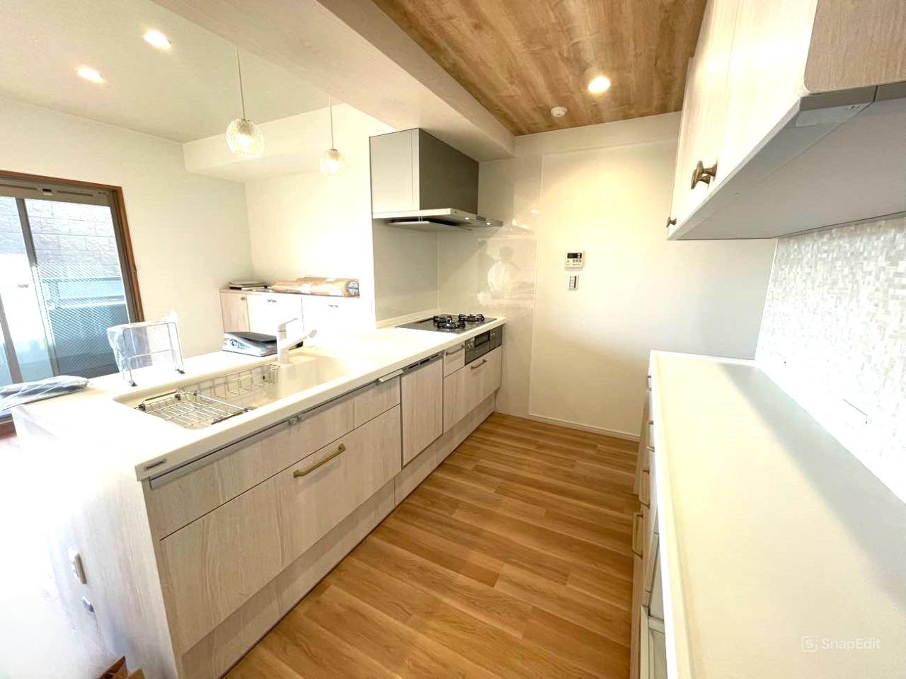吊戸棚と壁を取り払ったことで、キッチンは驚くほど開放的に。